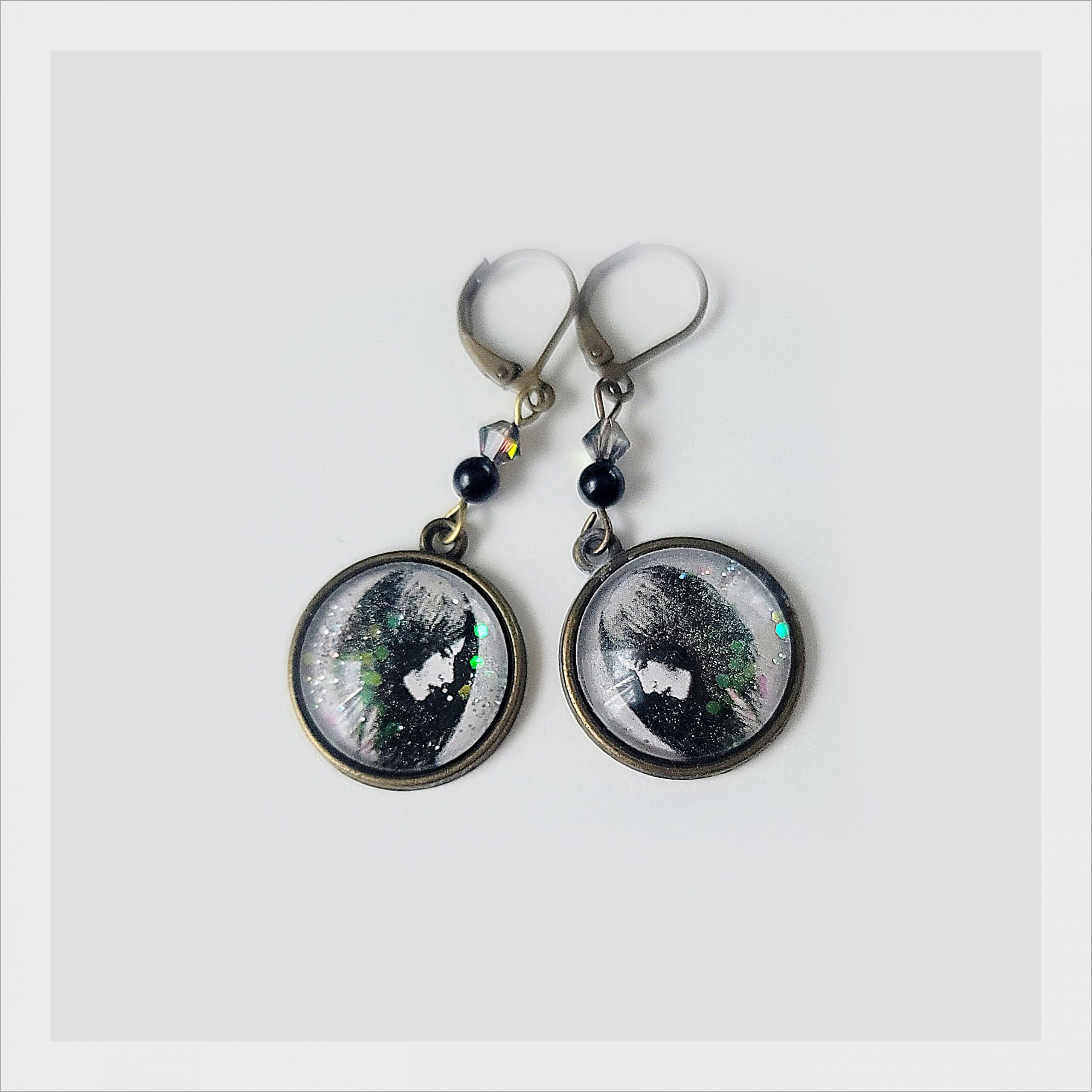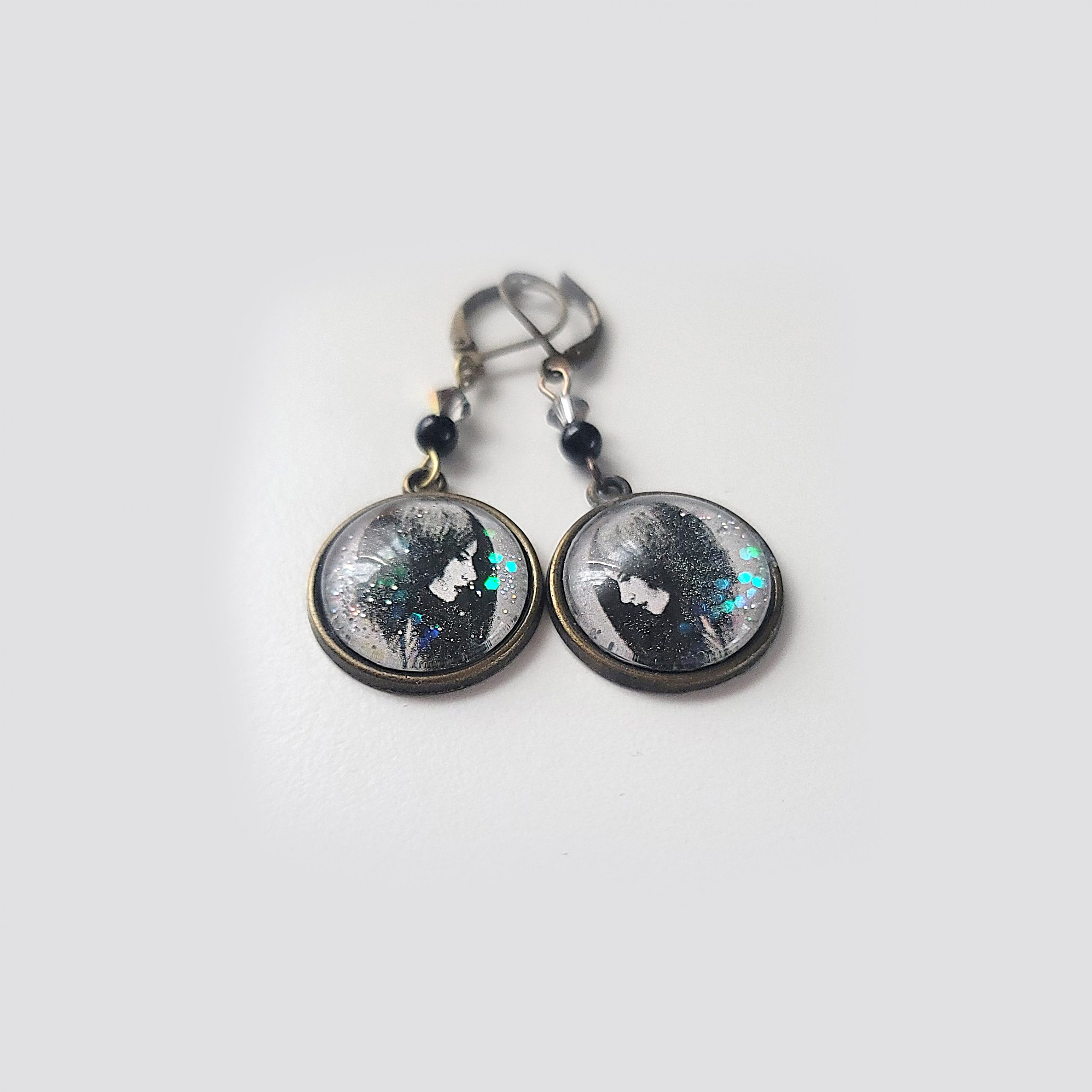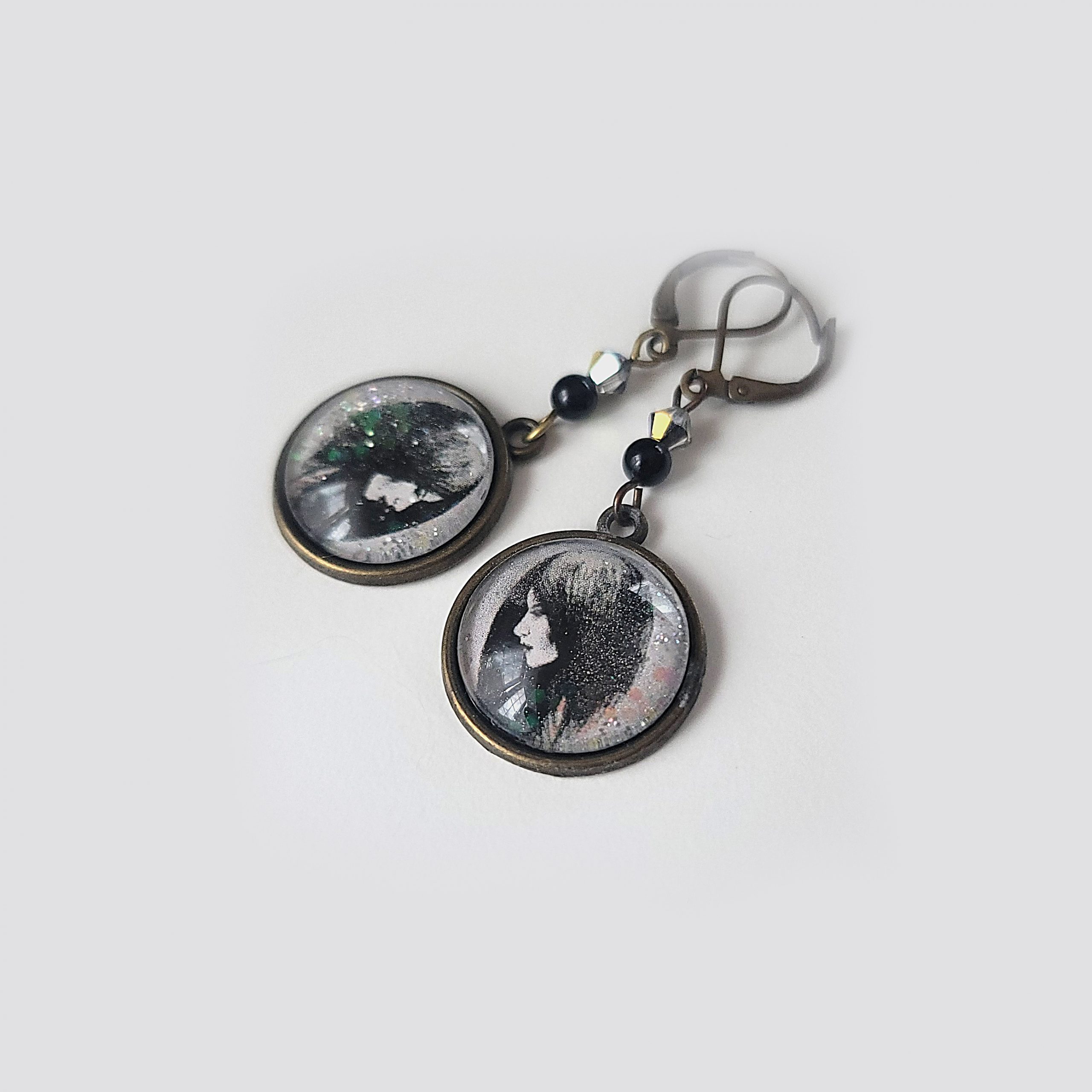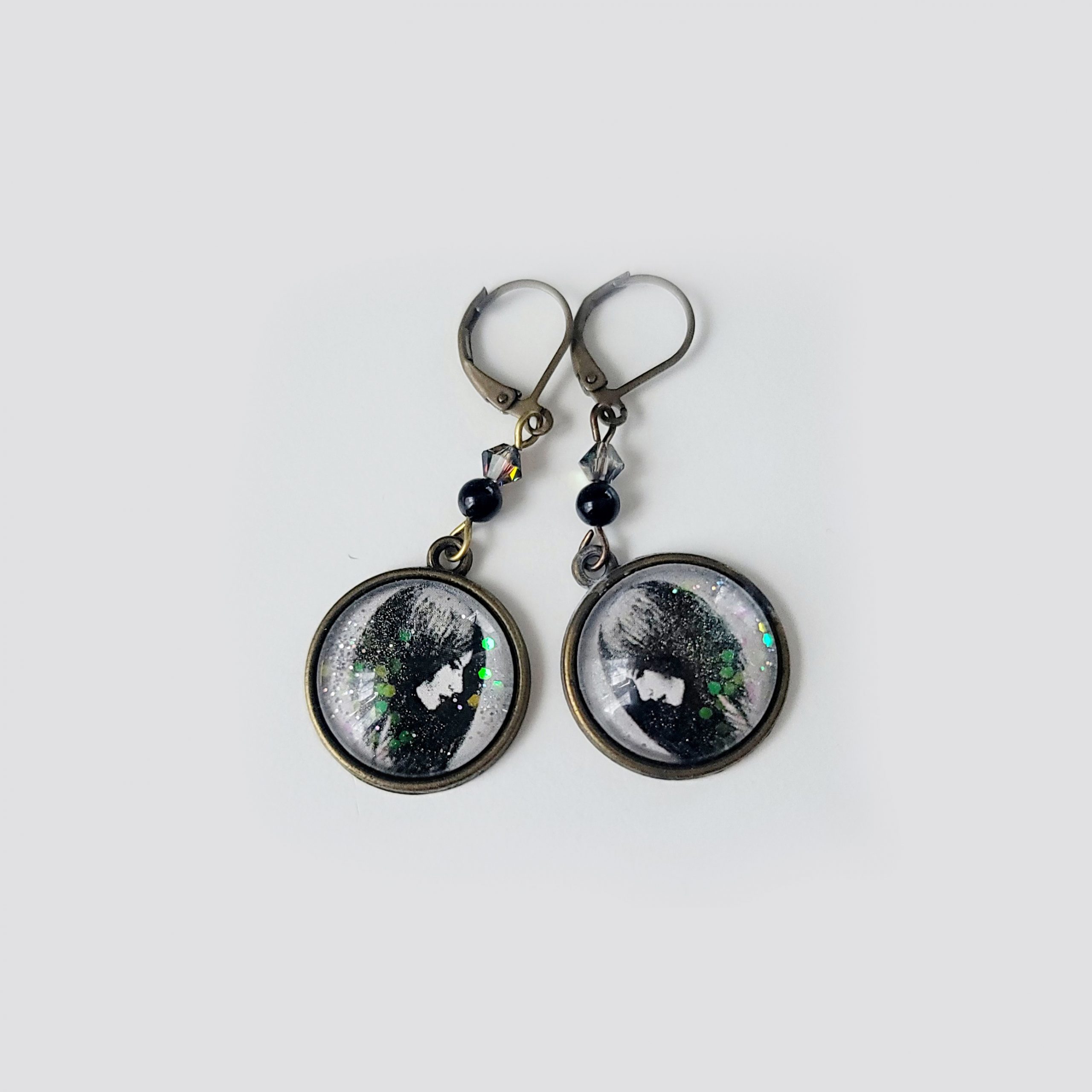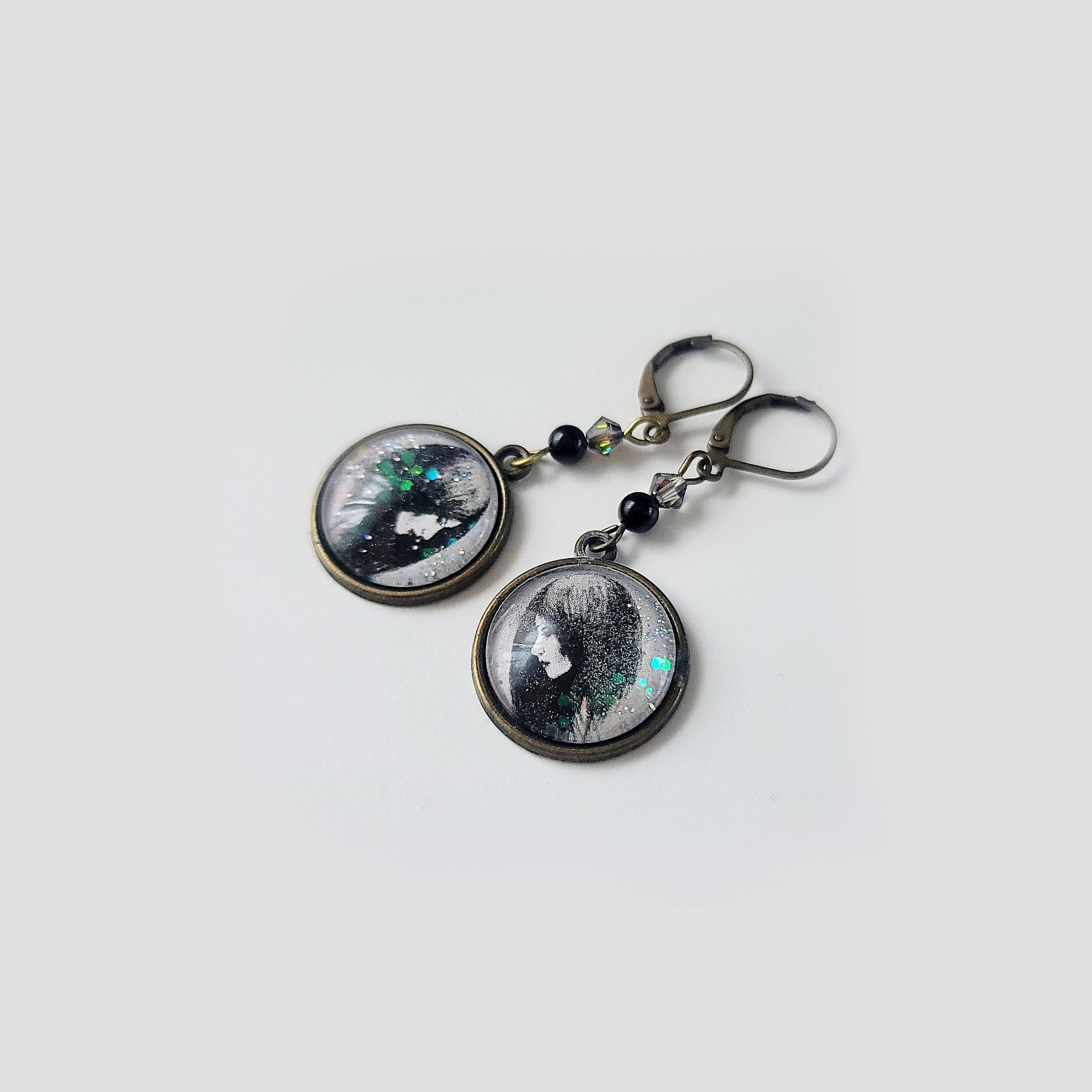 These expressive earrings feature a copy of my hand-drawn monochrome portrait, capturing a quiet, thoughtful moment. Sealed under an 18 mm glass cabochon with a touch of shimmering glitter, the design is completed with genuine onyx beads and faceted Swarovski crystals for a hint of sparkle. Antique bronze leverback hooks add a timeless finish.